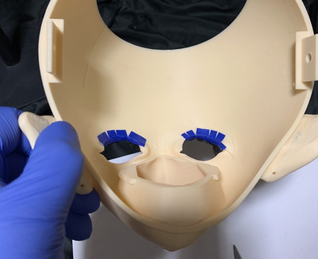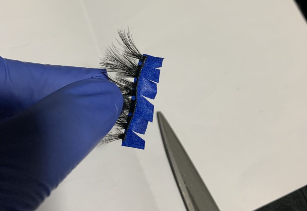 つけまつ毛はフェイス裏側から取り付け。つけまつ毛のノリ側をマスキングテープの接着面に半分接着させ、その後写真のようにマスキングテープ側に切り込みをいれます。その後、取り付けます。