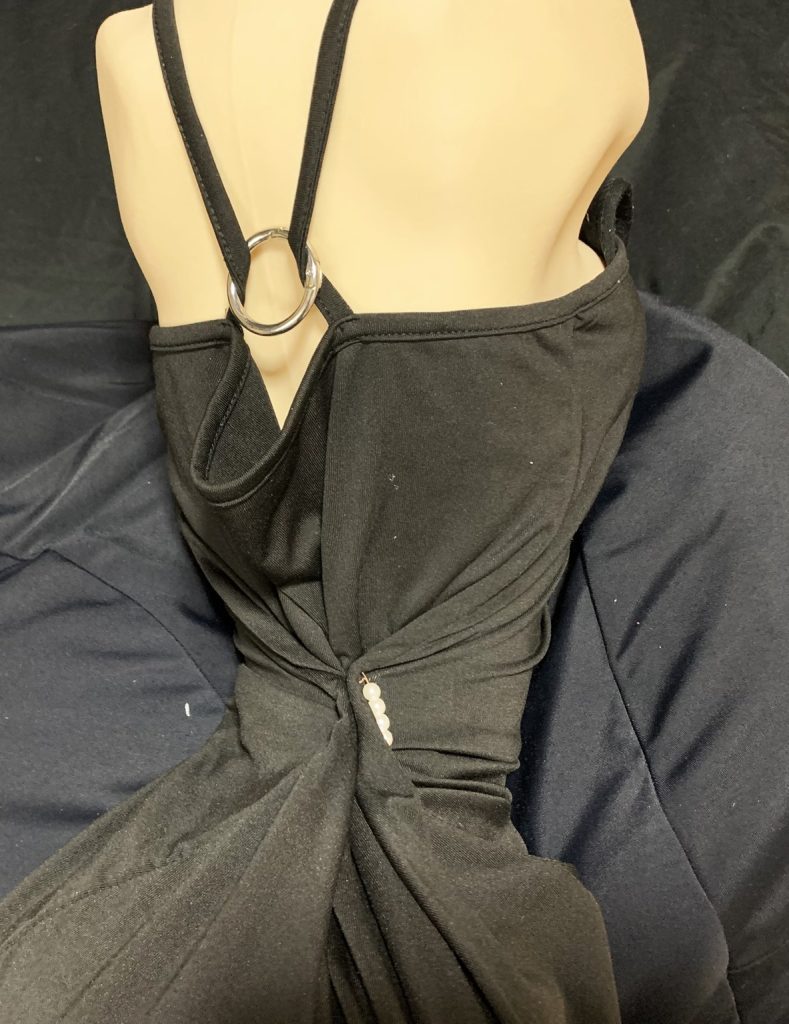 写真ではブローチでウェストを絞り、肩紐はカラビナで押さえてます。