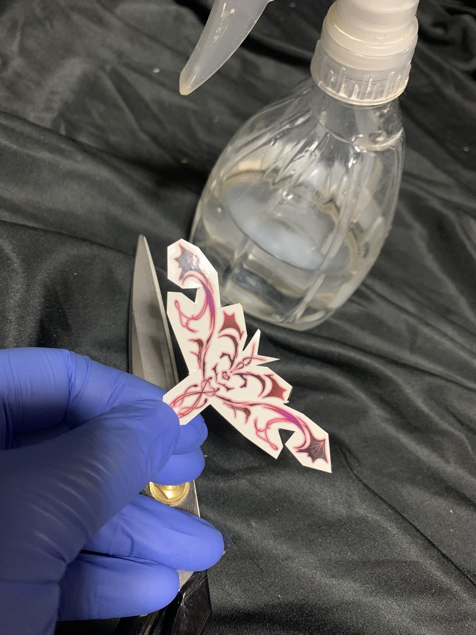 曲面に貼りやすいよう切り込みいれたシールを霧吹きで少しづつ貼付 →ドール肌のタトゥーを確認→OKなら十分に乾燥→ つやけしクリアー(薄く重ねる)