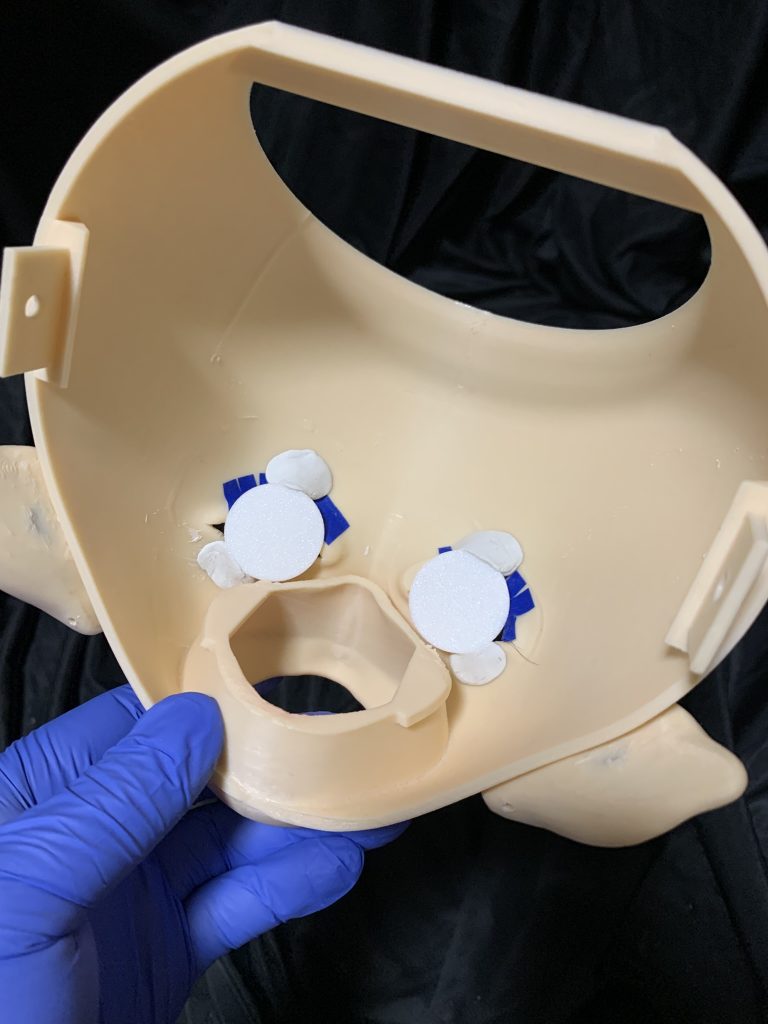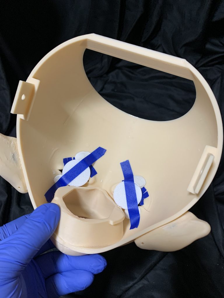 白目はフェイス裏側から交換。市販のエアコンパテで軽く固定して、上からマスキングテープを貼ります。