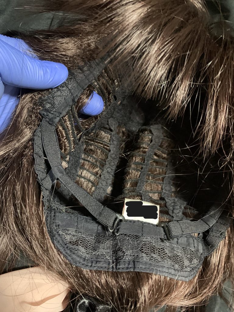 耐熱ウィッグの使用を推奨します。角のあるフェイスにウィッグを通す際は写真のように角位置のブロックをカットします。また頭周りサイズの調整は最小を選んでいます。