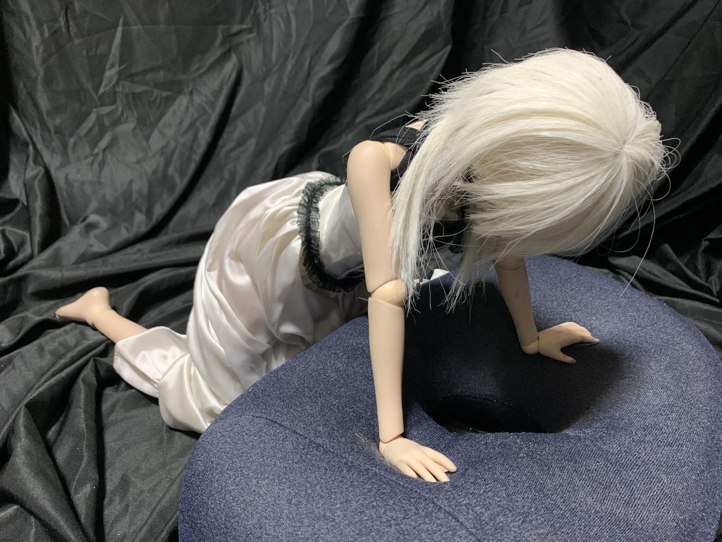 大きいビーズクッションや布団を重ねたのものなど、段差のある場所にドールを寝かし並べ、腕を立ててご観賞ください。